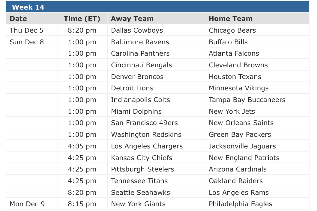 NFL Week 14 Schedule December 4, 2019 Football In High Heels NFL 0 Here’s the week 14 NFL schedule from fftoday.com! Football In High Heels on Social Media Tweet Share this: Click to share on X (Opens in new window) X Click to share on Reddit (Opens in new window) Reddit Click to share on Tumblr (Opens in new window) Tumblr Click to share on Pinterest (Opens in new window) Pinterest Click to share on Facebook (Opens in new window) Facebook Related footballnflnfl schedule